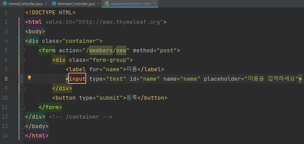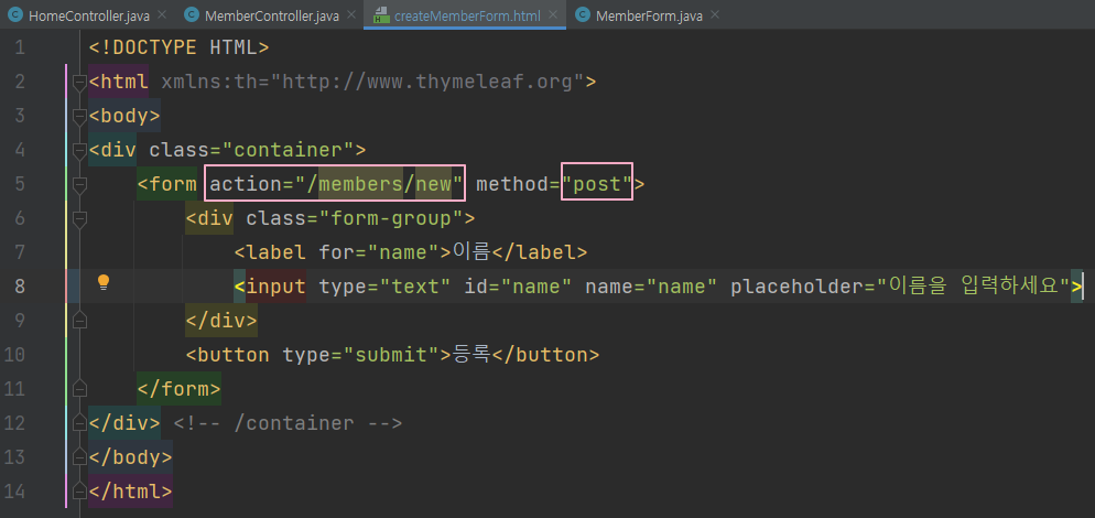 action의 URL 주소(/members/new)을 통해 post 방식으로 데이터가 넘어 온다
