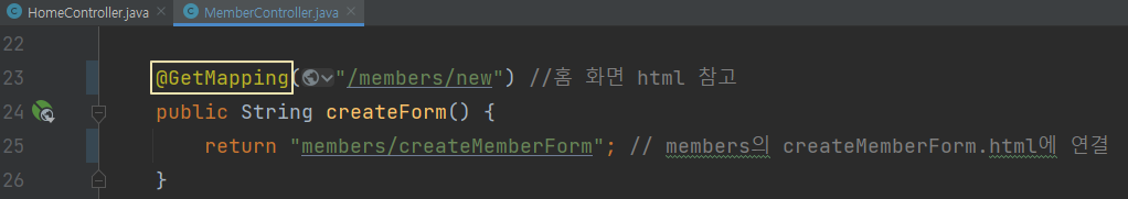 /members/new에 접속 시 createForm()이 매핑되어 createMemberForm으로 이동한다