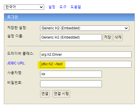 2-1 이후부터는 jdbc:h2:tcp://localhost/~/test로 접속한다