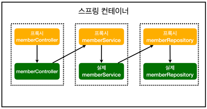 프록시라는가짜 memberService를 생성한다. 가짜 스프링 빈이 끝나면 실제 memberService를 실행한다. 프록시가 주입되는지 확인하려면 getClass()를 통해 콘솔에 출력하여 확인할 수 있다. (CGLIB은 복제하여 코드를 조작하는 기술이다.)