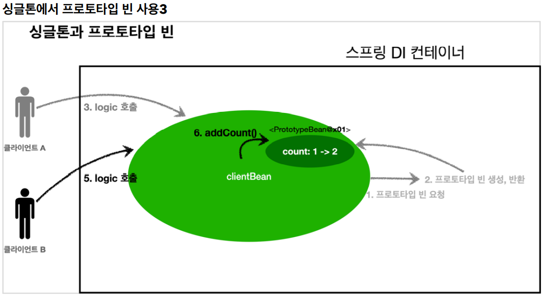 clientBean은 싱글톤이므로, 보통 스프링 컨테이너 생성 시점에 함께 생성되고, 의존관계 주입도 발생한다. 주입 시점에 스프링 컨테이너에 프로토타입 빈을 요청하여 내부 필드에 보관한다. (정확히는 참조값을 보관한다.)