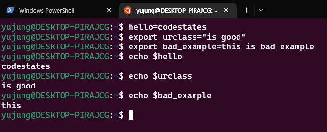 export urclass="is good" # 전역, 공백이 있을 때 따옴표로 묶기