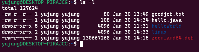 가장 왼쪽의 표현을 보면 hello.java 파일의 경우 -로 시작, linuxs는 d로 시작된다