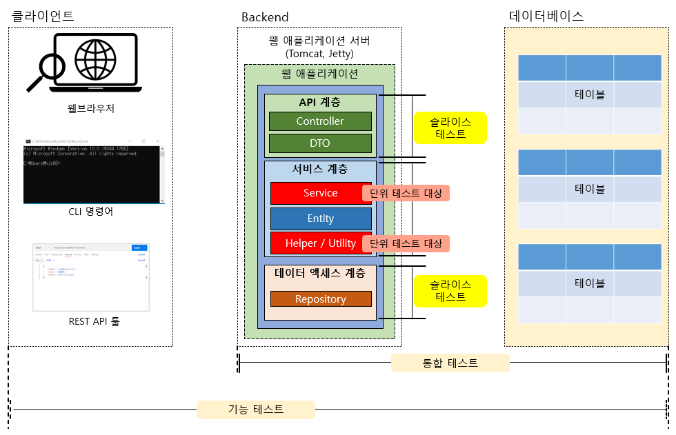 - 기능 테스트: 사용자 입장에서 애플리케이션의 기능이 올바르게 동작하는지 테스트한다. 일반적으로 테스트 전문 부서에서 진행하며, API 툴이나 데이터베이스까지 연관되어 있다.