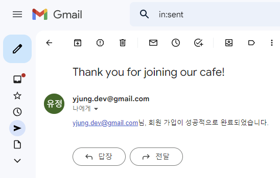 회원가입을 하면 이메일로 회원가입 성공 메시지를 전송할 수 있다!