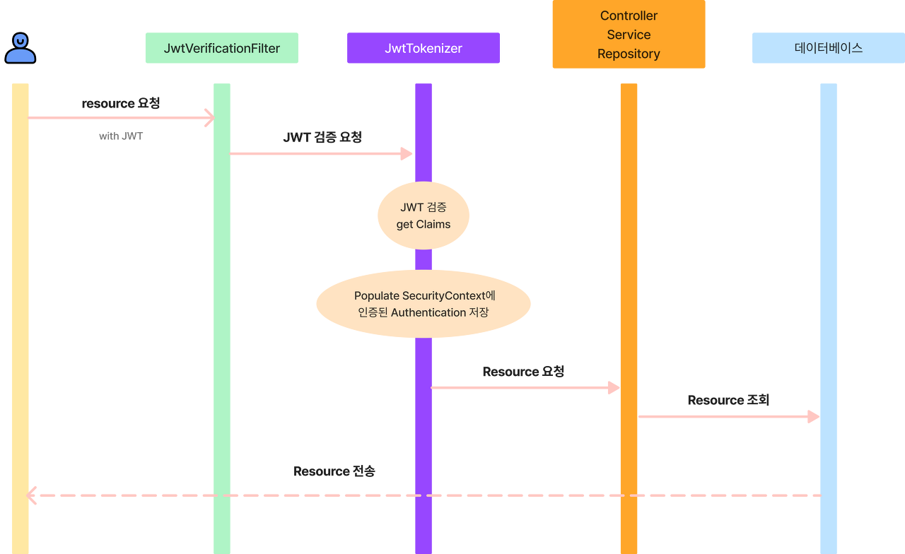 🌟 클라이언트에서 JWT를 이용하여 자격 증명이 필요한 리소스에 대한 요청을 보내면 request header를 통해 전달받은 JWT를 서버 측에서 검증한다.