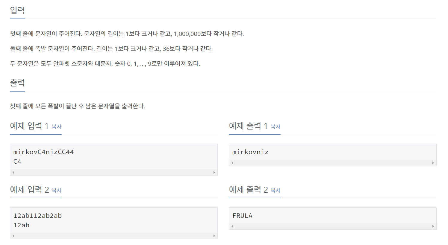 - 문자열과 폭발 문자열을 입력받는다. 문자열에 존재하는 모든 폭발 문자열을 제거한 문자열을 반환한다.
