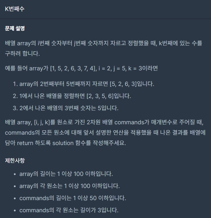 - 배열1의 i번째부터 j번째까지 수를 정렬하여 k번째 수를 반환해야 한다.