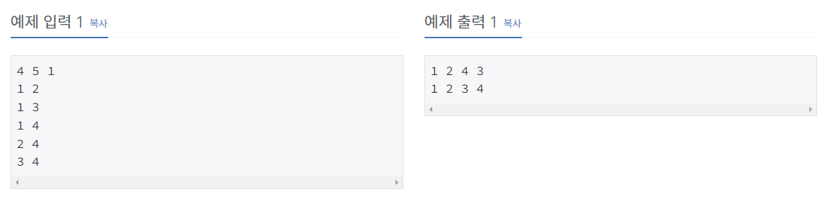 첫째 줄에 정점의 개수 N(1 ≤ N ≤ 1,000), 간선의 개수 M(1 ≤ M ≤ 10,000), 탐색을 시작할 정점의 번호 V가 주어진다. 다음 M개의 줄에는 간선이 연결하는 두 정점의 번호가 주어진다. 어떤 두 정점 사이에 여러 개의 간선이 있을 수 있다. 입력으로 주어지는 간선은 양방향이다.