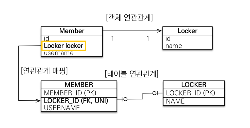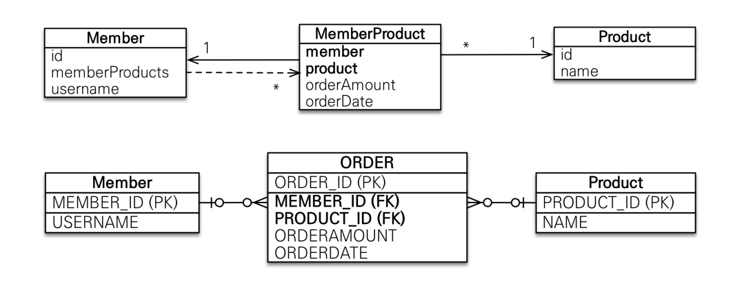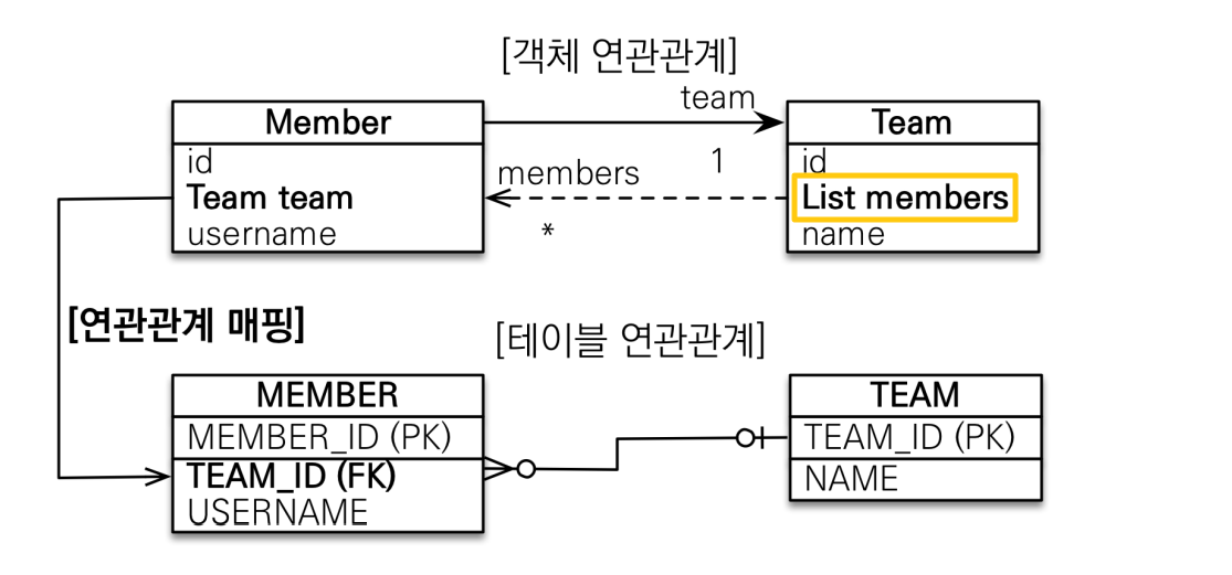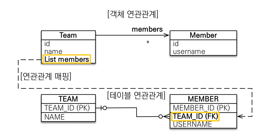 관계형 데이터베이스는 정규화된 테이블 2개로 다대다 관계를 표현할 수 없다. 연결 테이블을 추가해서 일대다, 다대일 관계로 풀어낼 수 있다. 반대로 객체는 컬렉션을 사용해서 객체 2개로 다대다 관계를 표현할 수 있다.