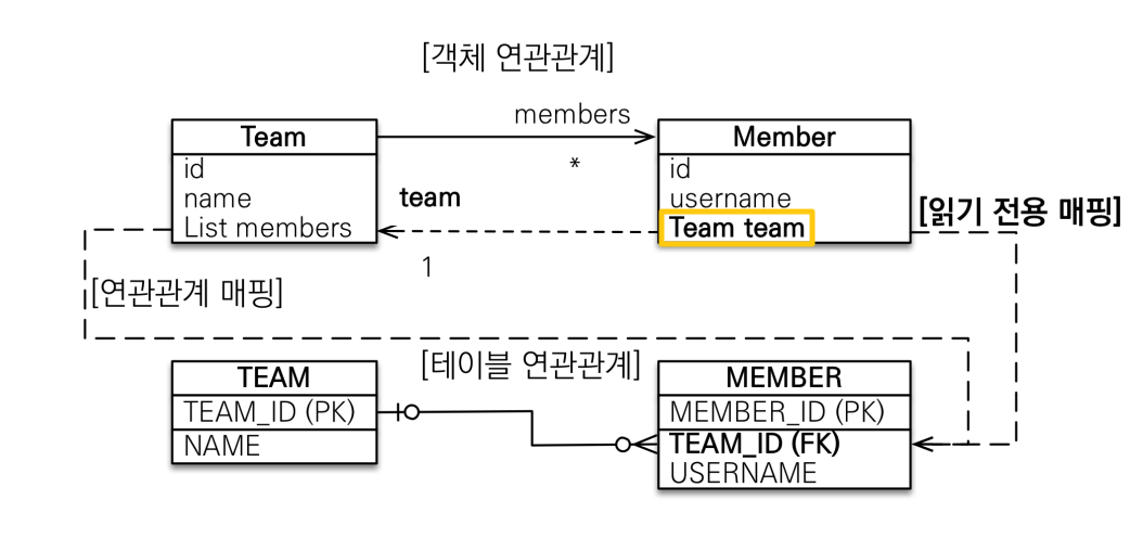 이런 매핑은 공식적으로 존재하지 않으나 읽기 전용 필드를 사용해서 양방향처럼 사용하는 방법이다.