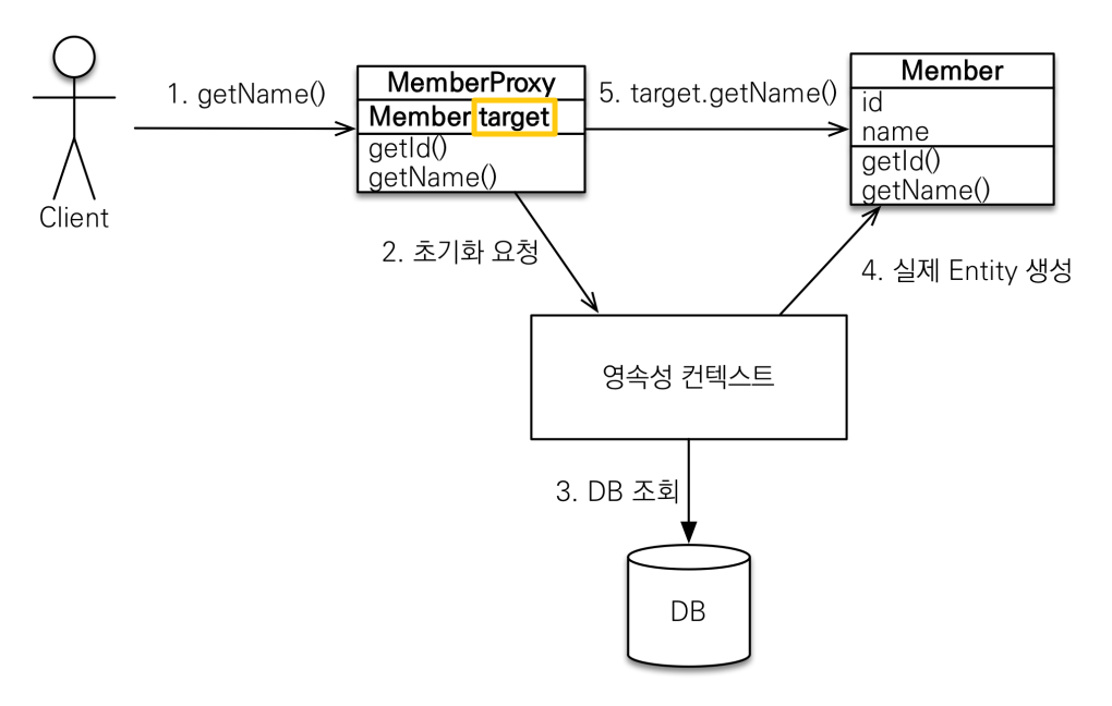 프록시는 실제 클래스를 상속 받아서 만들어진다. 실제 객체의 참조(target)를 보관한다. (초기에는 null이다. 영속성 컨텍스트에 초기화를 요청한다.) 프록시 객체를 호출하면 실제 객체의 메소드를 호출하게 된다.