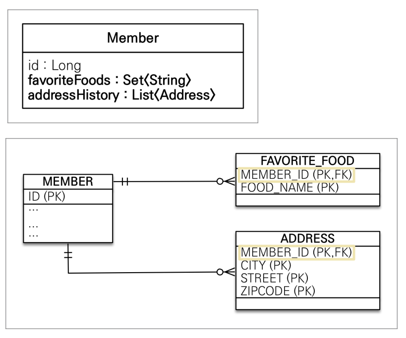 @Embeddable: 값 타입을 정의하는 곳에 표시@Embedded: 값 타입을 사용하는 곳에 표시- 기본 생성자 필수