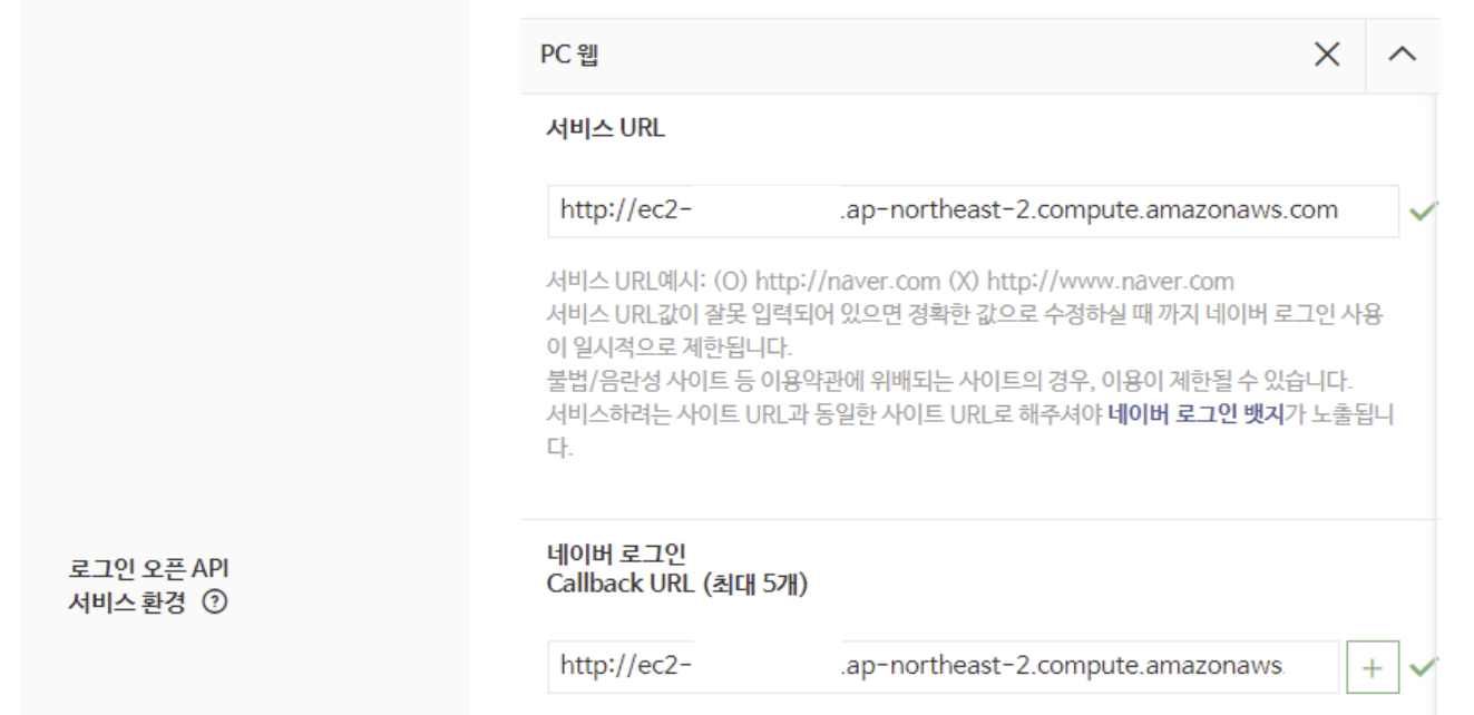 - Callback URL: 전체 주소를 등록한다. http://ec2☆.ap-northeast-2.compute.amazonaws.com:8080/login/oauth2/code/naver