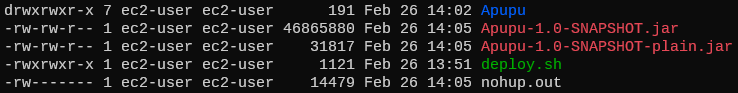 이 문제는 Spring Boot 2.5.0 버전 이상부터 나타날 수 있는 문제다. gradle로 빌드를 할 때 아래와 같이 jar 파일이 두 개가 생성되기 때문이다. Apupu-1.0-SNAPSHOT.jar 파일이 배포가 되어야 하는데 Apupu-1.0-SNAPSHOT-plain.jar가 배포되었던 것이다.