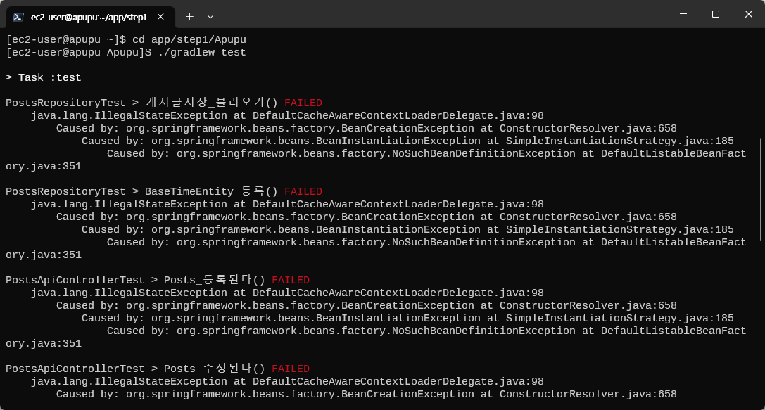 테스트를 돌리니 아래와 같이 오류가 발생했다. application-oauth.properties 파일은 보안상의 문제로 깃허브에 올리지 않았었는데, 이 파일 없이 테스트를 돌리니 오류가 발생했던 것이다. 파일을 FileZilla를 통해 전송해 주었다.