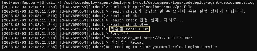 - 배포 이후 스프링 부트 2가 정상적으로 구동되는지 확인하고, nginx reload 명령어 (0.1초 소요)를 통해 스프링 부트 2를 바라보도록 한다.