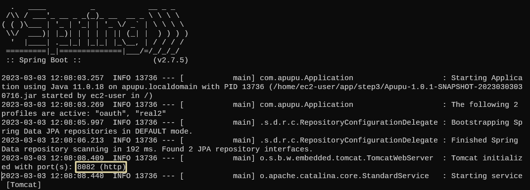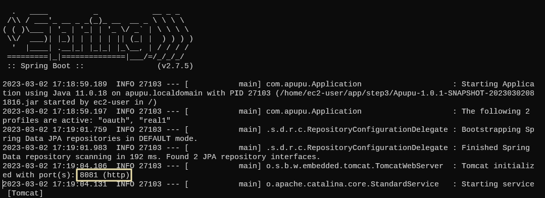스프링 부트 로그를 보고 싶다면 아래 명령어를 입력하면 된다.