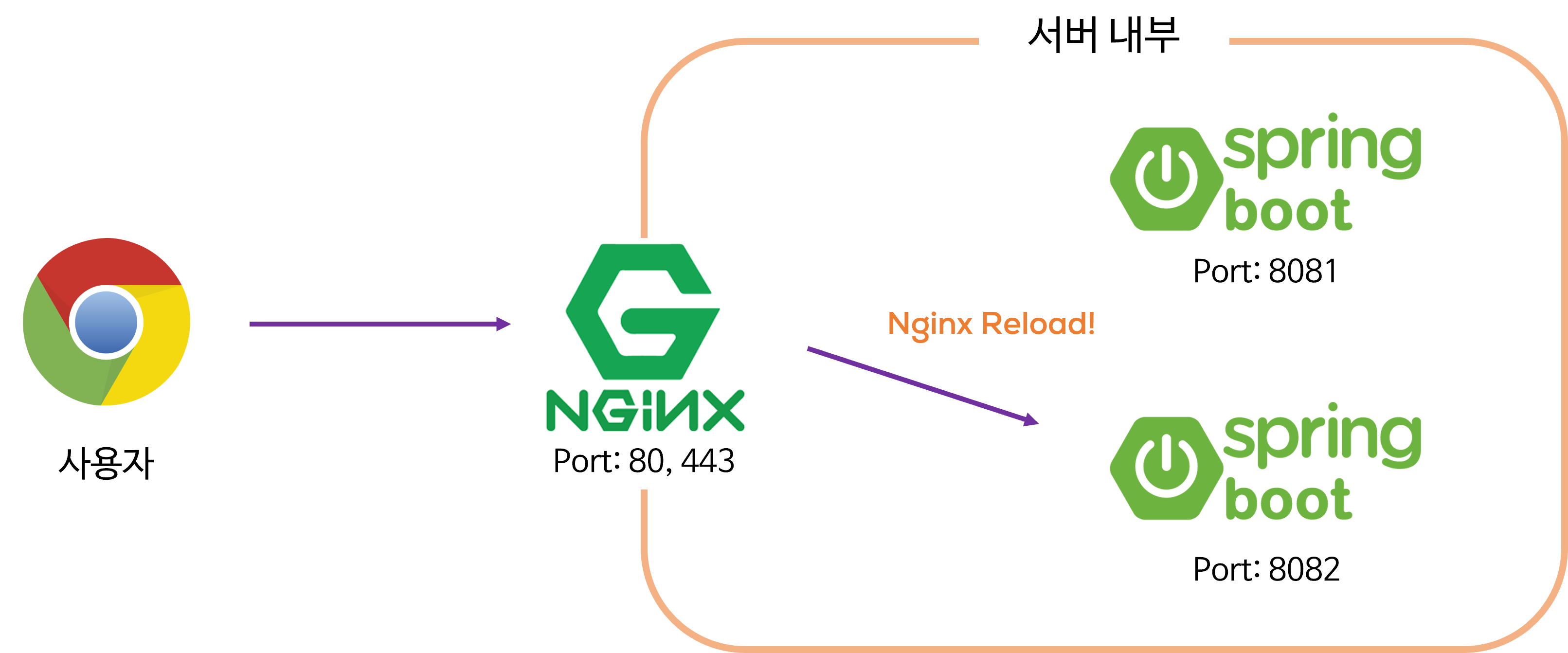 - 신규 배포가 필요하면 엔진엑스와 연결되지 않은 스프링 부트2로 배포된다. 엔진엑스는 스프링 부트 1을 바라보고 있으므로 배포하는 동안 서비스가 중단되지 않는다.