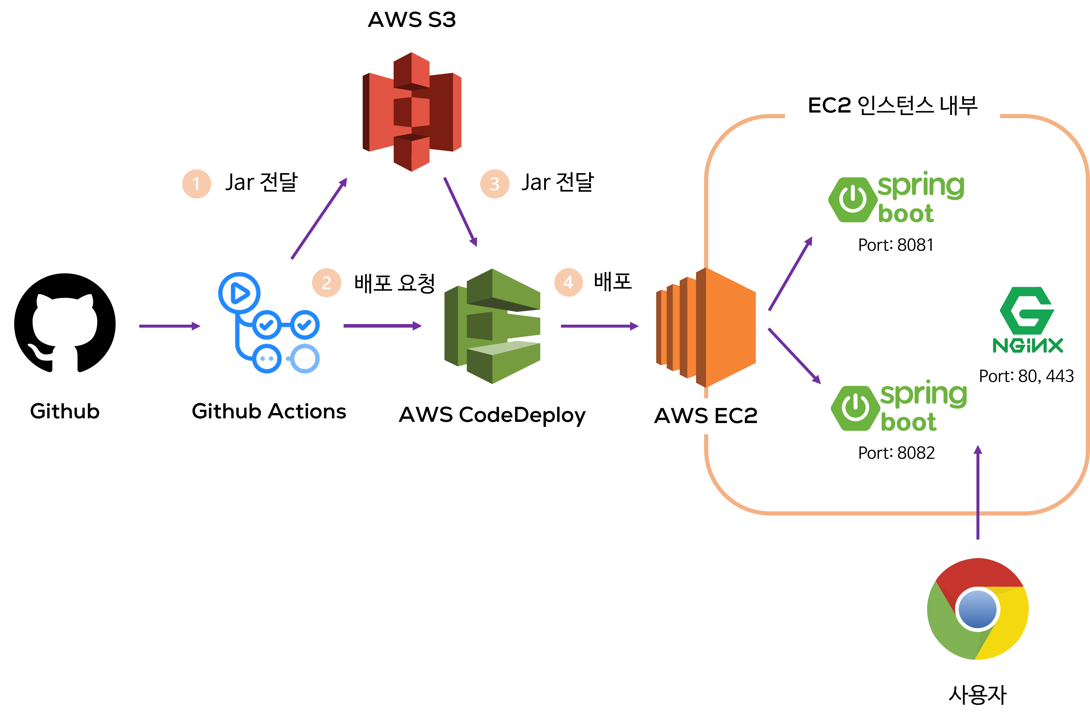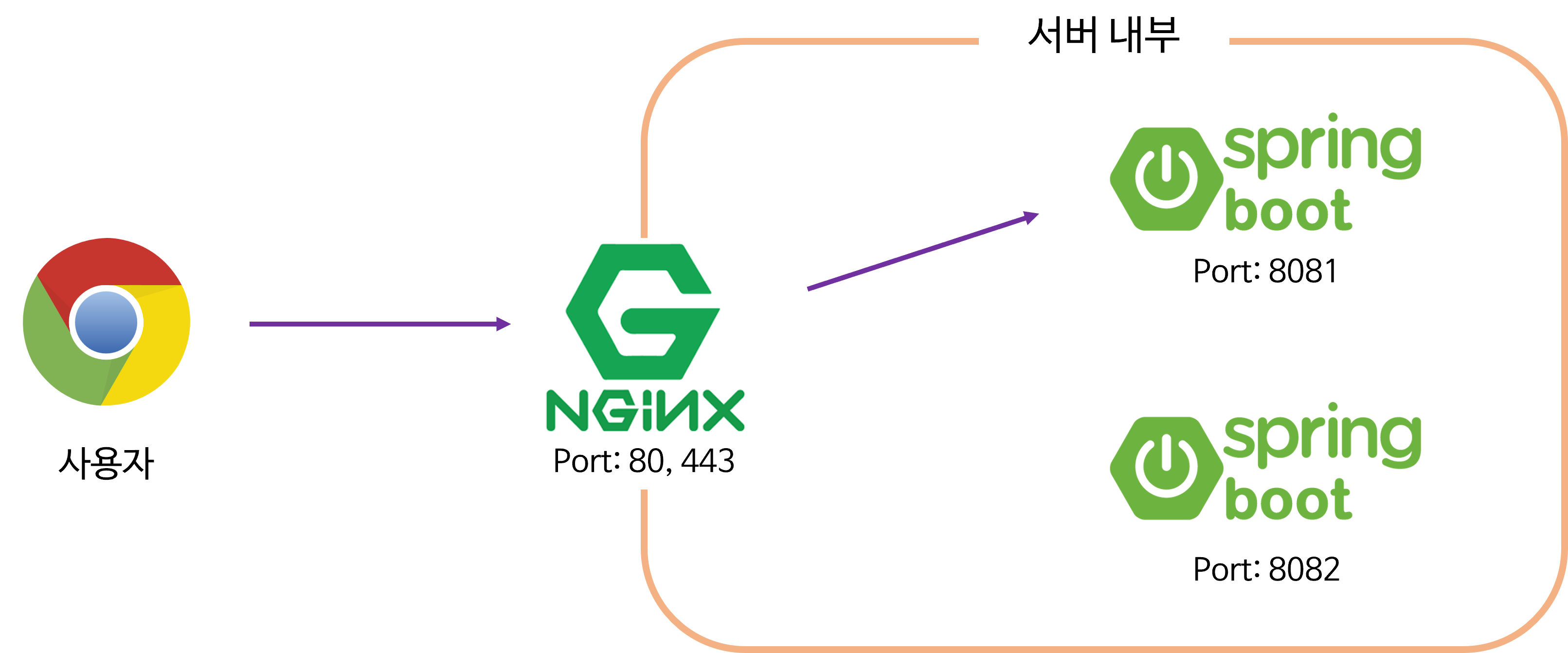 위와 같이 하나의 EC2 혹은 리눅스 서버에 엔진엑스 1대와 스프링 부트 Jar를 2대 사용한다.
