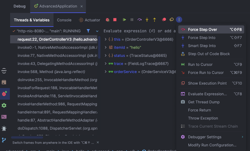 - Force Step Into: 실행 라인으로 이동하나, Stepping을 무시