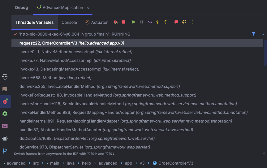 Break Point에 Break가 걸리면 아래의 화면으로 바뀌고, 여러 버튼들을 사용할 수 있다.