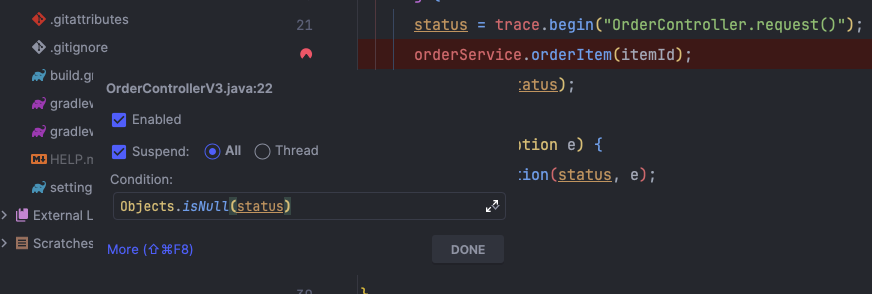 조건을 부여하여 실행하고 싶은 경우에는 Break Point를 우클릭해서 지정할 수 있다. 특히 반복문에서 특정 값이 들어왔을 때의 수행을 확인하고 싶을 때 유용하다.