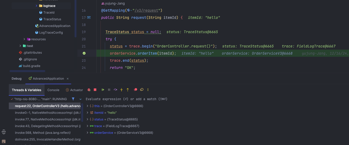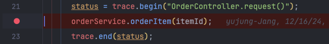 - Step Over: Break Point가 걸린 라인 실행 후 다음 라인 이동 (22번 → 23번 라인)