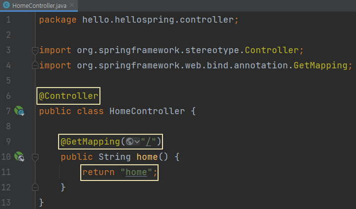 HomeController클래스를 생성하여 @Controller을 붙인 후 @GetMapping("/")을 지정하여 홈 화면을 설정,