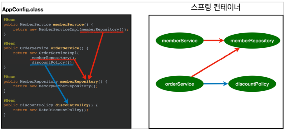 ˙기존에는 개발자가 AppConfig로 객체를 생성하고 DI를 했지만, 이제 스프링 컨테이너를 통해 사용한다.