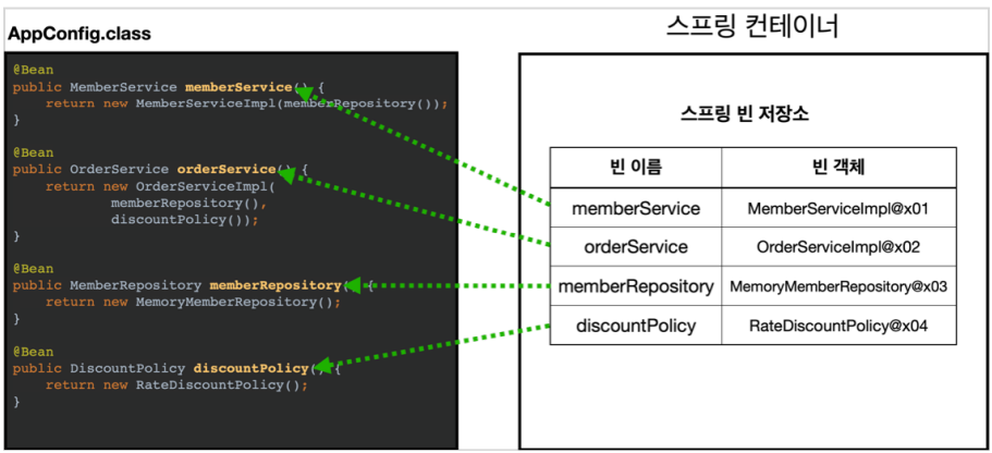 각 메서드에 @Bean을 붙여 준다. 이렇게 하면 스프링 컨테이너에 스프링 빈으로 등록한다.