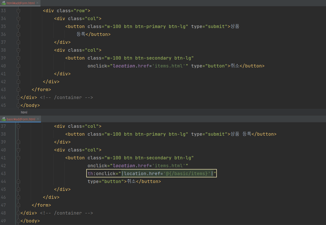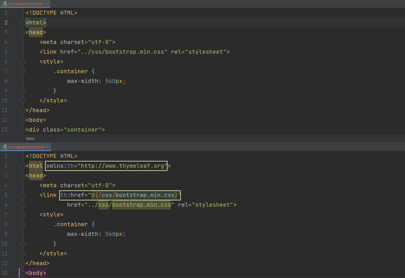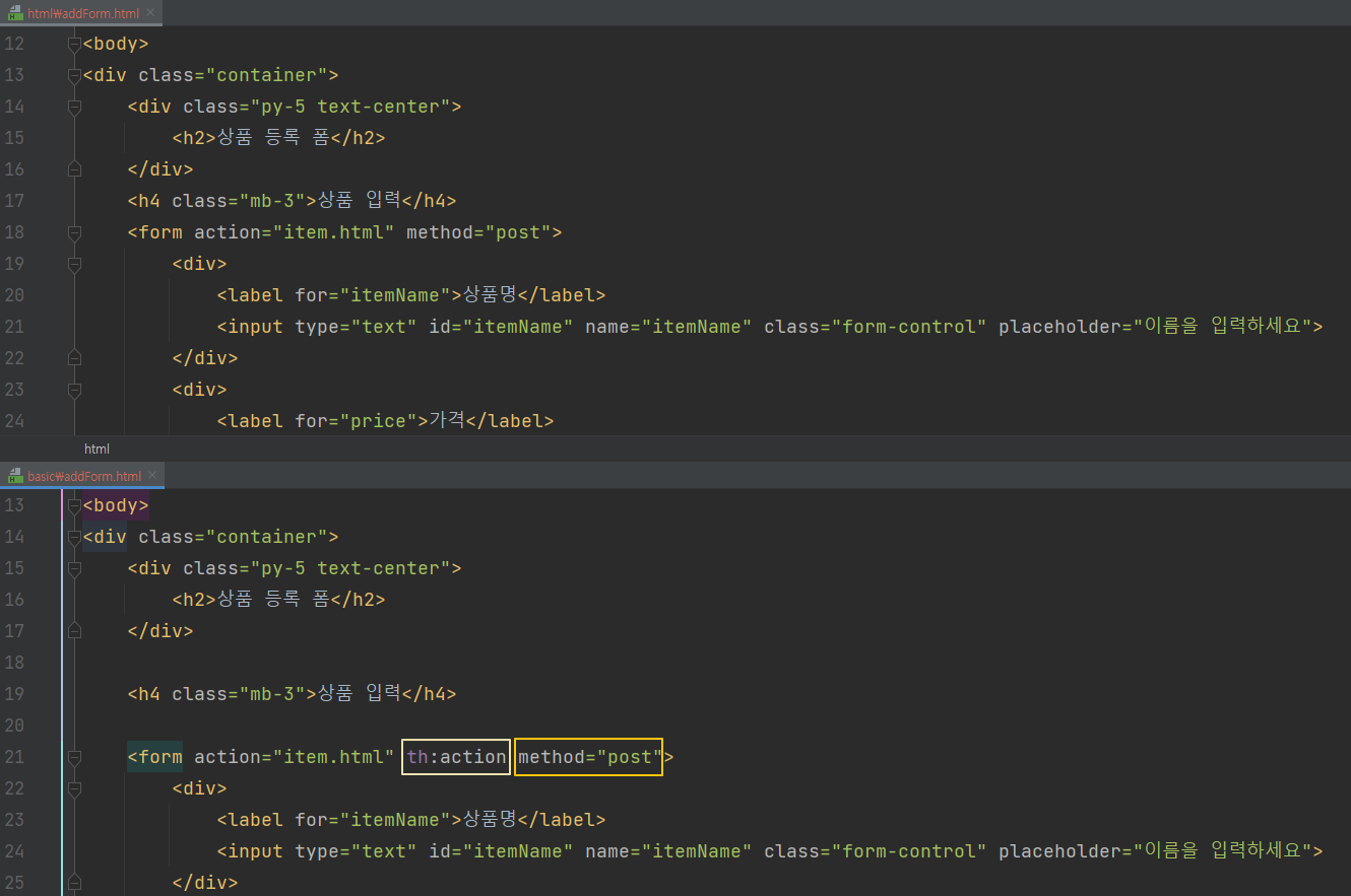 상: 정적 HTML, 하: 타임리프를 적용한 동적 파일