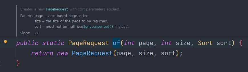 * PageRequest of(int page, int size, Sort sort)
