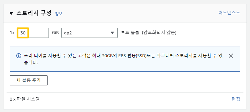 스토리지는 하드디스크라고 부르는 서버의 디스크(SSD 포함)를 이야기하며, 서버의 용량을 설정한다. 프리티어로 30GB까지 가능해서 30GB를 선택했다.