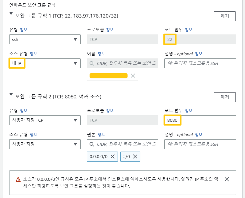 - SSH이면서 22 포트인 경우: AWS EC2에 터미널로 접속할 때이다. pem 키가 없으면 접속이 안 되지만 유출될 경우를 대비해 전체 오픈을 하면 안 된다!!! 정해진 IP에서만 접속할 수 있도록 집 IP에서만 접속 가능하도록 했다.
